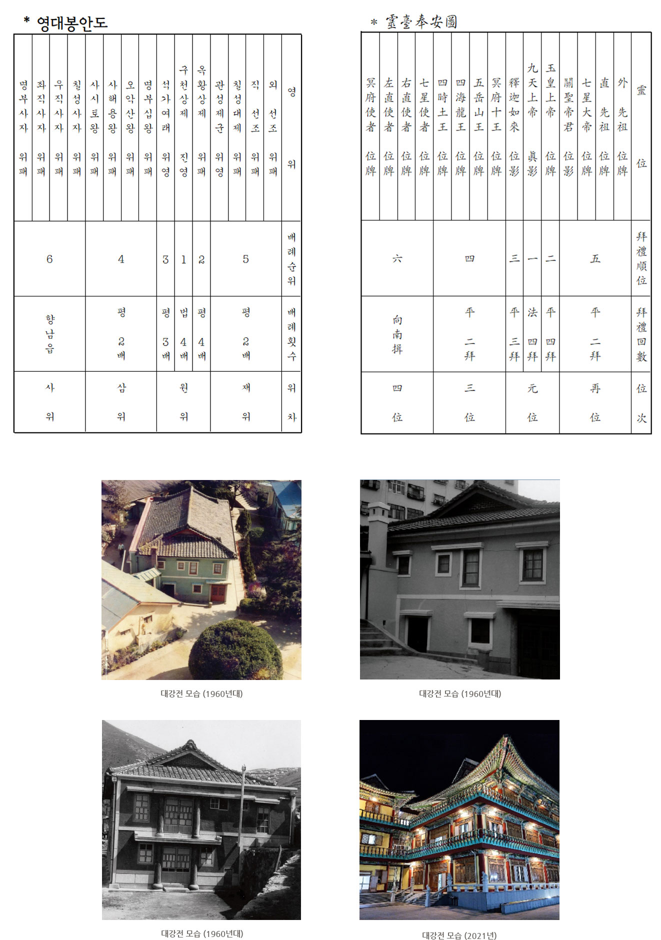 이 성전에는 태극도 신앙의 대상인 양위상제님의 진영과 천지대신명의 위패가 모셔져 있습니다. (총 15 신위)