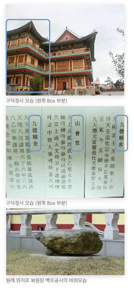2018년 5월 20일에는 기도 모실때의 납폐지에서 납폐할 곳 (산회당, 구덕정사)을 복원하였습니다. -2018년 3월에 구덕정사 내부를 도주님 재새시의 모습으로 복원하였고 백우바위도 원래 있던 곳으로 환원하였습니다.